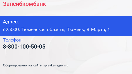 Запсибкомбанк по адресу 625000, Тюменская область, Тюмень, 8 Марта, 1 в дальнейшем Организация, размещена в следующих категориях: