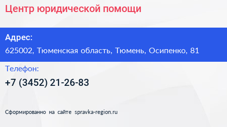 Центр юридической помощи по адресу 625002, Тюменская область, Тюмень, Осипенко, 81 в дальнейшем Организация, размещена в следующих категориях: