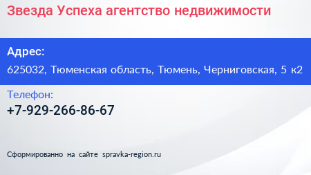 Звезда Успеха, агентство недвижимости по адресу 625032, Тюменская область, Тюмень, Черниговская, 5 к2 в дальнейшем Организация, размещена в следующих категориях: