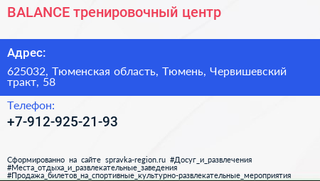 BALANCE, тренировочный центр по адресу 625032, Тюменская область, Тюмень, Червишевский тракт, 58 в дальнейшем Организация, размещена в следующих категориях: