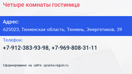 Четыре комнаты, гостиница по адресу 625023, Тюменская область, Тюмень, Энергетиков, 39 в дальнейшем Организация, размещена в следующих категориях: