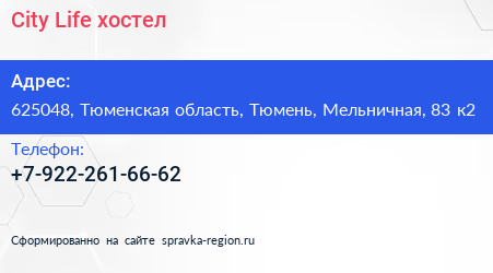 City Life, хостел по адресу 625048, Тюменская область, Тюмень, Мельничная, 83 к2 в дальнейшем Организация, размещена в следующих категориях: