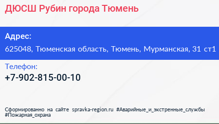ДЮСШ Рубин города Тюмень по адресу 625048, Тюменская область, Тюмень, Мурманская, 31 ст1 в дальнейшем Организация, размещена в следующих категориях: