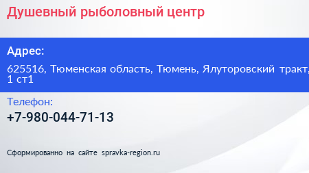 Душевный, рыболовный центр по адресу 625516, Тюменская область, Тюмень, Ялуторовский тракт, 1 ст1 в дальнейшем Организация, размещена в следующих категориях:
