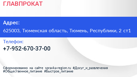 ГЛАВПРОКАТ по адресу 625003, Тюменская область, Тюмень, Республики, 2 ст1 в дальнейшем Организация, размещена в следующих категориях: