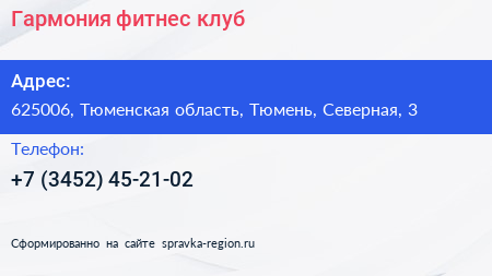 Гармония, фитнес-клуб по адресу 625006, Тюменская область, Тюмень, Северная, 3 в дальнейшем Организация, размещена в следующих категориях: