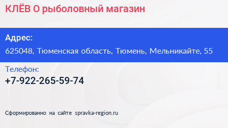 КЛЁВ`О, рыболовный магазин по адресу 625048, Тюменская область, Тюмень, Мельникайте, 55 в дальнейшем Организация, размещена в следующих категориях: