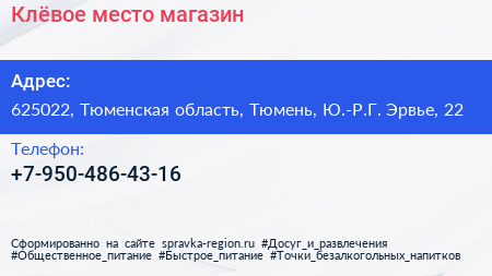 Клёвое место, магазин по адресу 625022, Тюменская область, Тюмень, Ю.-Р.Г. Эрвье, 22 в дальнейшем Организация, размещена в следующих категориях: