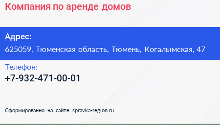 Компания по аренде домов по адресу 625059, Тюменская область, Тюмень, Когалымская, 47 в дальнейшем Организация, размещена в следующих категориях: