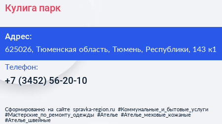 Кулига-парк по адресу 625026, Тюменская область, Тюмень, Республики, 143 к1 в дальнейшем Организация, размещена в следующих категориях: