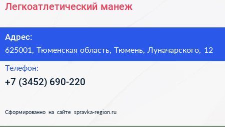 Легкоатлетический манеж по адресу 625001, Тюменская область, Тюмень, Луначарского, 12 в дальнейшем Организация, размещена в следующих категориях: