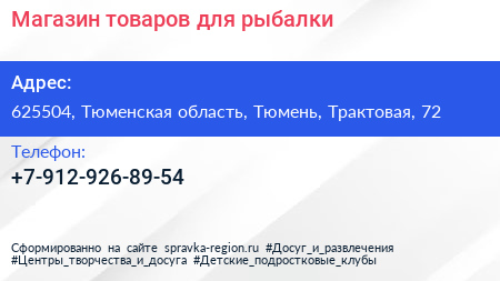 Магазин товаров для рыбалки по адресу 625504, Тюменская область, Тюмень, Трактовая, 72 в дальнейшем Организация, размещена в следующих категориях: