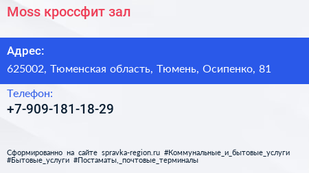 Moss, кроссфит-зал по адресу 625002, Тюменская область, Тюмень, Осипенко, 81 в дальнейшем Организация, размещена в следующих категориях: