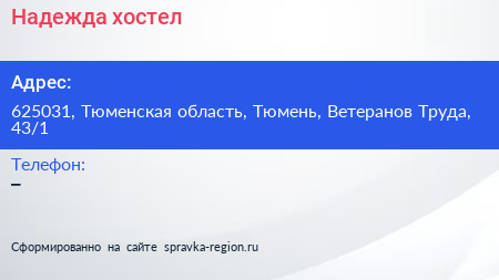 Надежда, хостел по адресу 625031, Тюменская область, Тюмень, Ветеранов Труда, 43/1 в дальнейшем Организация, размещена в следующих категориях: