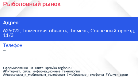Рыболовный рынок по адресу 625022, Тюменская область, Тюмень, Солнечный проезд, 11/3 в дальнейшем Организация, размещена в следующих категориях: