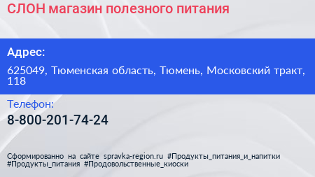 СЛОН, магазин полезного питания по адресу 625049, Тюменская область, Тюмень, Московский тракт, 118 в дальнейшем Организация, размещена в следующих категориях: