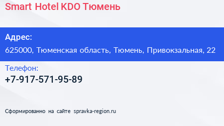 Smart Hotel KDO Тюмень по адресу 625000, Тюменская область, Тюмень, Привокзальная, 22 в дальнейшем Организация, размещена в следующих категориях: