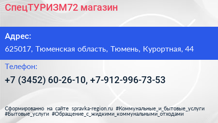 СпецТУРИЗМ72, магазин по адресу 625017, Тюменская область, Тюмень, Курортная, 44 в дальнейшем Организация, размещена в следующих категориях: