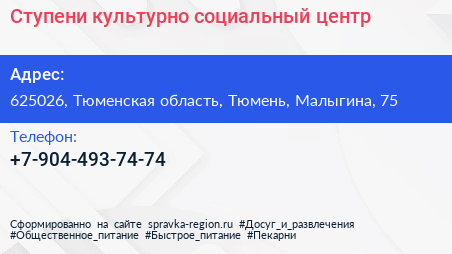 Ступени, культурно-социальный центр по адресу 625026, Тюменская область, Тюмень, Малыгина, 75 в дальнейшем Организация, размещена в следующих категориях: