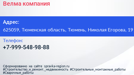 Велма, компания по адресу 625059, Тюменская область, Тюмень, Николая Егорова, 19 в дальнейшем Организация, размещена в следующих категориях: