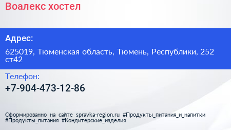 Воалекс, хостел по адресу 625019, Тюменская область, Тюмень, Республики, 252 ст42 в дальнейшем Организация, размещена в следующих категориях: