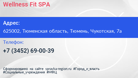Wellness Fit & SPA по адресу 625002, Тюменская область, Тюмень, Чукотская, 7а в дальнейшем Организация, размещена в следующих категориях: