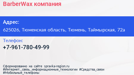 BarberWax, компания по адресу 625026, Тюменская область, Тюмень, Таймырская, 72а в дальнейшем Организация, размещена в следующих категориях: