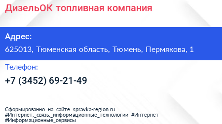 ДизельОК, топливная компания по адресу 625013, Тюменская область, Тюмень, Пермякова, 1 в дальнейшем Организация, размещена в следующих категориях: