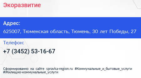 Экоразвитие по адресу 625007, Тюменская область, Тюмень, 30 лет Победы, 27 в дальнейшем Организация, размещена в следующих категориях: