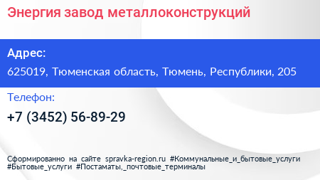 Энергия, завод металлоконструкций по адресу 625019, Тюменская область, Тюмень, Республики, 205 в дальнейшем Организация, размещена в следующих категориях: