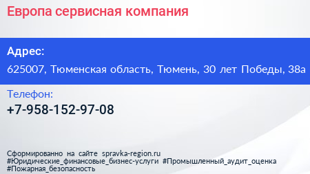 Европа, сервисная компания по адресу 625007, Тюменская область, Тюмень, 30 лет Победы, 38а в дальнейшем Организация, размещена в следующих категориях: