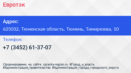 Евротэк по адресу 625032, Тюменская область, Тюмень, Тимирязева, 10 в дальнейшем Организация, размещена в следующих категориях: