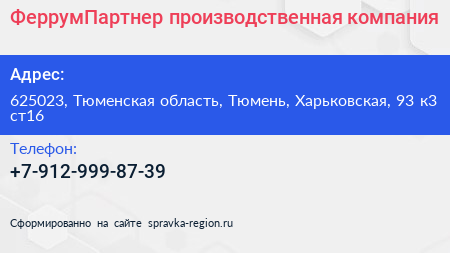 ФеррумПартнер, производственная компания по адресу 625023, Тюменская область, Тюмень, Харьковская, 93 к3 ст16 в дальнейшем Организация, размещена в следующих категориях: