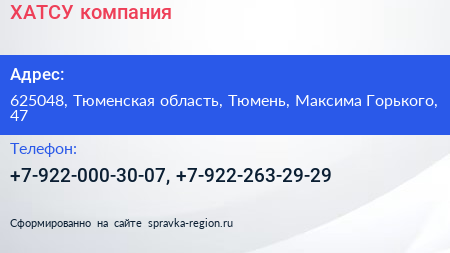 ХАТСУ, компания по адресу 625048, Тюменская область, Тюмень, Максима Горького, 47 в дальнейшем Организация, размещена в следующих категориях: