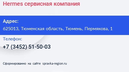 Hermes, сервисная компания по адресу 625013, Тюменская область, Тюмень, Пермякова, 1 в дальнейшем Организация, размещена в следующих категориях: