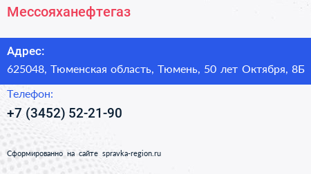Мессояханефтегаз по адресу 625048, Тюменская область, Тюмень, 50 лет Октября, 8Б в дальнейшем Организация, размещена в следующих категориях: