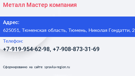Металл-Мастер, компания по адресу 625051, Тюменская область, Тюмень, Николая Гондатти, 2 в дальнейшем Организация, размещена в следующих категориях: