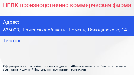 НГПК, производственно-коммерческая фирма по адресу 625003, Тюменская область, Тюмень, Володарского, 14 в дальнейшем Организация, размещена в следующих категориях:
