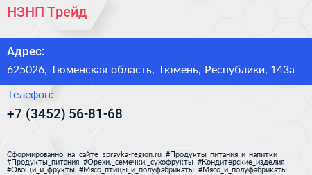 НЗНП Трейд по адресу 625026, Тюменская область, Тюмень, Республики, 143а в дальнейшем Организация, размещена в следующих категориях: