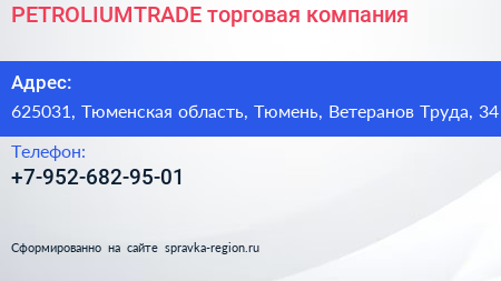 PETROLIUMTRADE, торговая компания по адресу 625031, Тюменская область, Тюмень, Ветеранов Труда, 34 в дальнейшем Организация, размещена в следующих категориях:
