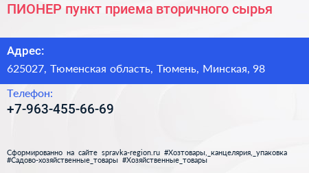 ПИОНЕР, пункт приема вторичного сырья по адресу 625027, Тюменская область, Тюмень, Минская, 98 в дальнейшем Организация, размещена в следующих категориях: