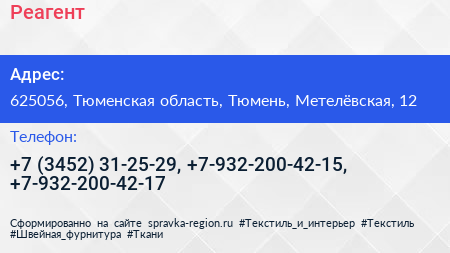 Реагент по адресу 625056, Тюменская область, Тюмень, Метелёвская, 12 в дальнейшем Организация, размещена в следующих категориях: