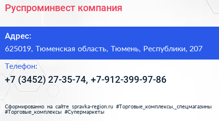 Руспроминвест, компания по адресу 625019, Тюменская область, Тюмень, Республики, 207 в дальнейшем Организация, размещена в следующих категориях: