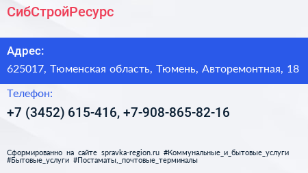 СибСтройРесурс по адресу 625017, Тюменская область, Тюмень, Авторемонтная, 18 в дальнейшем Организация, размещена в следующих категориях: