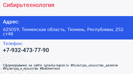 Сибирьтехнология по адресу 625019, Тюменская область, Тюмень, Республики, 252 ст48 в дальнейшем Организация, размещена в следующих категориях: