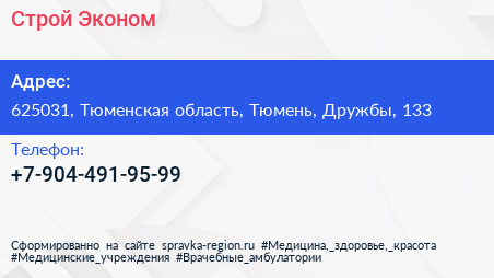 Строй Эконом по адресу 625031, Тюменская область, Тюмень, Дружбы, 133 в дальнейшем Организация, размещена в следующих категориях: