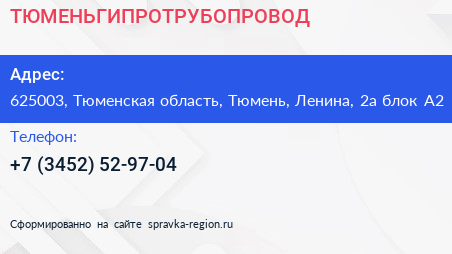 ТЮМЕНЬГИПРОТРУБОПРОВОД по адресу 625003, Тюменская область, Тюмень, Ленина, 2а блок А2 в дальнейшем Организация, размещена в следующих категориях: