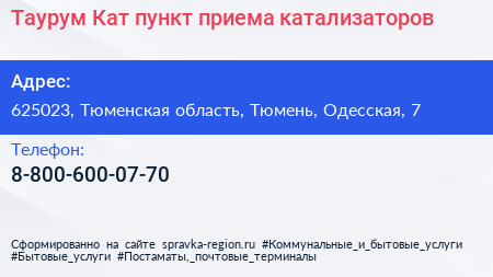 Таурум Кат, пункт приема катализаторов по адресу 625023, Тюменская область, Тюмень, Одесская, 7 в дальнейшем Организация, размещена в следующих категориях: