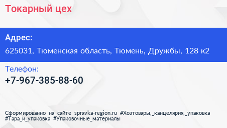 Токарный цех по адресу 625031, Тюменская область, Тюмень, Дружбы, 128 к2 в дальнейшем Организация, размещена в следующих категориях: