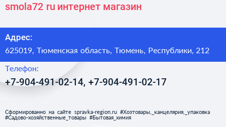 smola72.ru, интернет-магазин по адресу 625019, Тюменская область, Тюмень, Республики, 212 в дальнейшем Организация, размещена в следующих категориях: